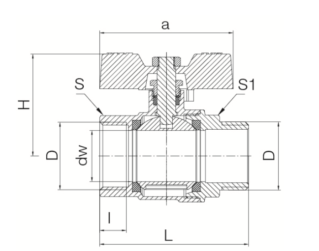 Ball valve with gland and aluminum butterfly handle, nut–male thread version