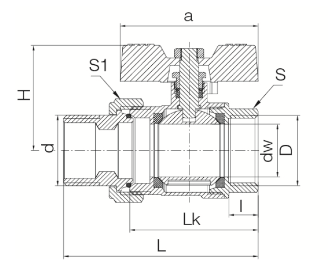 Ball valve with gland and half-union, equipped with an aluminum butterfly handle
