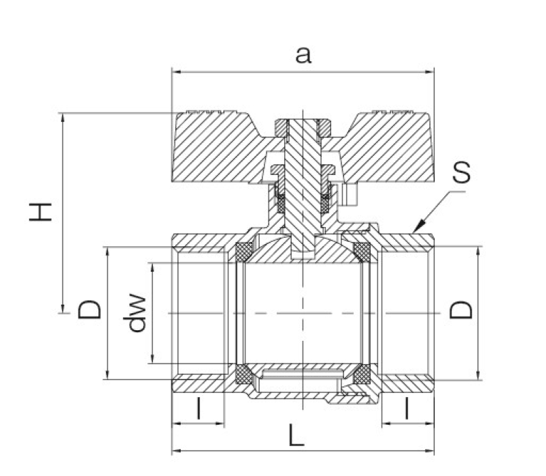 Ball valve with packing gland, with aluminum butterfly handle, female–female version