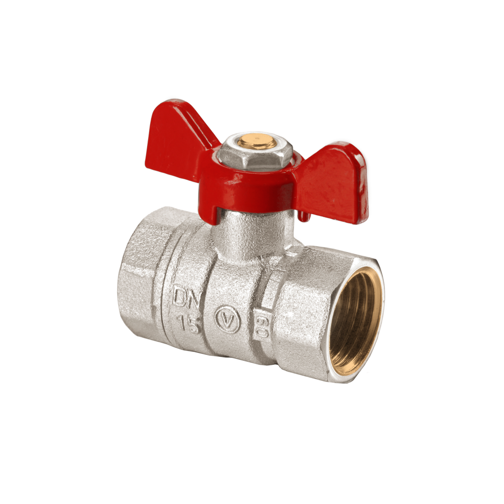 Robinet cu bilă cu presgarnitură, cu fluture din aluminiu, versiune piuliță–piuliță